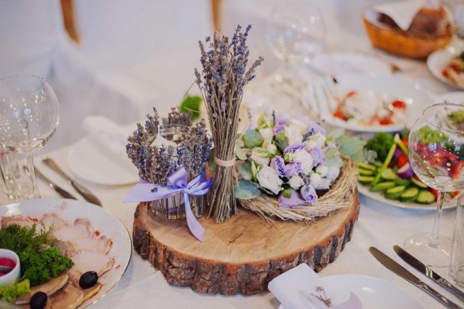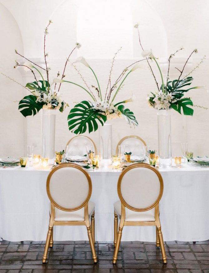 Тканевые салфетки на столах гостей повторяют оттенок декорирования. Очень необычно и элегантно смотрятся живые растения в узких стоячих вазонах или плетеных кашпо. Цветочных композиций не должно быть много. Достаточного одной вазы на длинный гостевой стол. Если места распределены за круглыми столиками, то стоит ограничиться красивыми бутоньерками.
