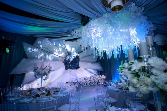 Стиль зала напоминает дворцовую роскошь, где невеста и жених являются основными точками для созерцания, а обстановка вокруг – только полотно.