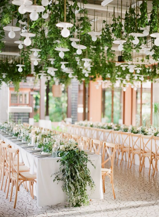 Если торжество проводится за городом, на территории открытой беседки или загородного дома, не стоит забывать о преобладании зелени в пейзаже. Для того, чтобы общий стиль не вызывал диссонанса, выберите белый цвет. Он богемно сочтется с зеленым и его оттенками.