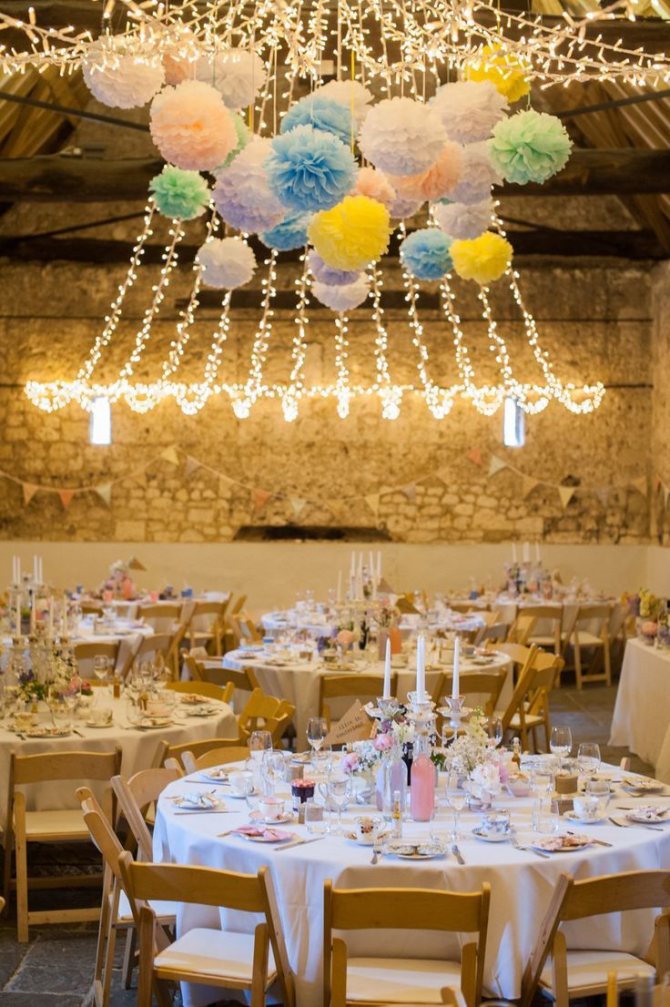 Простым в создании, доступным, ярким, по-своему неповторимым украшением свадебного зала являются шары, которые делают из бумаги или ткани. Эти разноцветные яркие помпоны размещают возле потолка, крепят на стенах, фиксируют на подставках и устанавливают вместо цветов в напольные вазы.