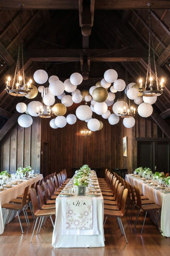 Если условия банкетного зала позволяют, можно использовать для украшения светильники в форме подвесных фонарей: