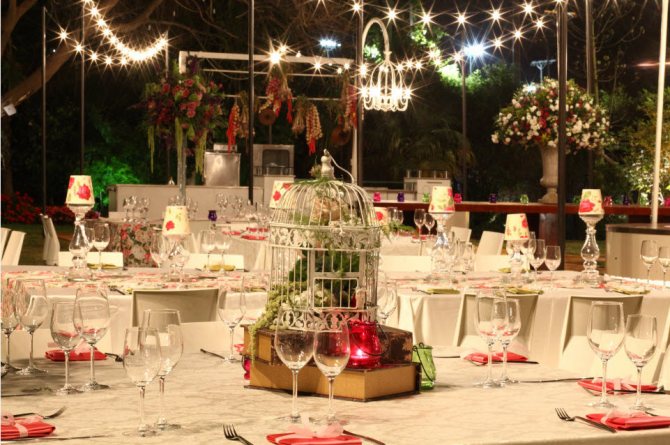 На природе такие торжества легко устроить, задрапировав дневное оформление в более темные тона, используя гирлянды и зеркальные шары. Это тематика, сопряженная с шиком, большим количеством алкоголя, блестящими нарядами и обстановкой.