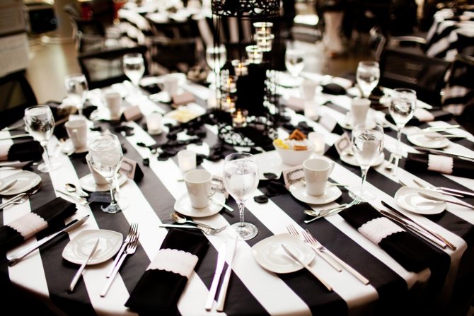 Стены зала легко декорируются в полоску, или в однотонные стены включают черные участки драпировки. Черные скатерти углом накрываются белой скатертью сверху, а черные стулья обвязываются белыми бантами.