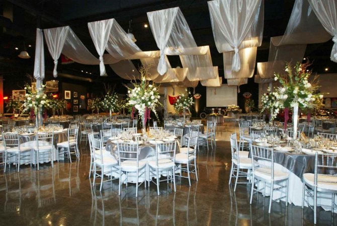 | Ткань | Красивый дорогой текстиль обладает способностью превратить даже самое заурядное помещение в королевский дворец. Тканью украшают столы, драпируют стулья, оформляют стены. Для украшения арок, колонн и лестниц используют атласные ленты. А закрепив отрезы ткани под потолком, можно создать некое подобие шатра. |