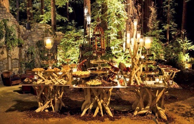 На природе сделать тематическое торжество много проще благодаря возможности не экономить на территории. Беседки и шатры сразу могут приобрести форму необходимых объектов.