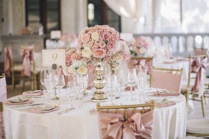 Персиковый, бежевый, светлый кофейный, нежно – розовый и светло – голубой. Градация цвета может меняться от общего – более светлого, к деталям – более темным. Если стены зала оформлены в светло – бежевый, то скатерти и накидки для стульев могут быть чуть темнее. Букеты на столе, или бутоньерки должны сочетаться с нарядом молодоженов.