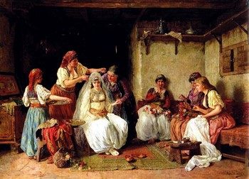 Поэтому, как только процессия отправлялась от дома невесты к жениху, то все громко пели песни, пританцовывали. Мужчины нередко рассказывали похабные шутки, тем самым настраивая на нужный лад.