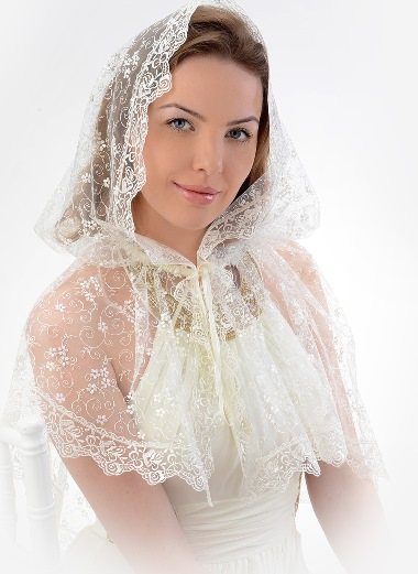 - Если подвенечное платье имеет кружевную отделку, то надо подобрать кружевной платок с таким же в точности рисунком, иначе будет диссонанс в наряде. В таком случае рекомендуется выбрать венчальный головной убор из гладкой ткани и минимальным наличием отделки. Выбирая кружевную накидку, образ будет нежным и загадочным, ко всему он завершит образ невесты.
