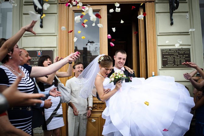 Есть и несколько примет, которые начинают действовать, когда уже законные молодожены выходят из загса. Считается, что после этого супруг должен пронести свою любимую до машины на руках.