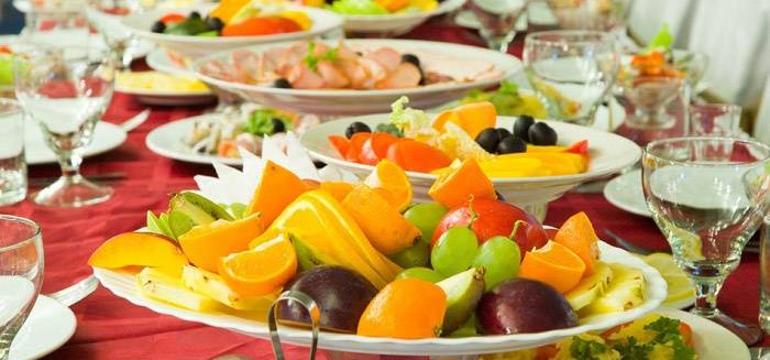 - общее меню праздничного стола. Обилие закусок, горячих блюд насытит гостей раньше, чем дело дойдет до десерта. Они могут и не пожелать есть торт. Если же банкет планируется в формате скромного фуршета, а программа торжества рассчитана на активное движение – лучше позаботиться о большем размере порции;
