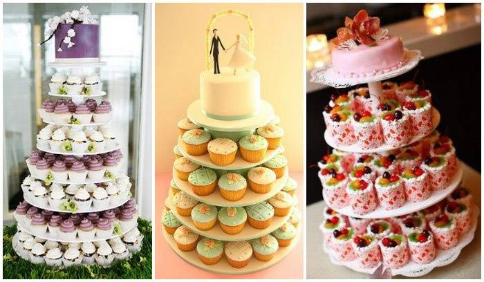 - В дополнение к торту можно сделать небольшие капкейки. Они станут и дополнительным украшением, и запасным количеством десерта. Особенно такие пирожные понравятся детям – это стоит учесть, если на свадьбе будет много малышей.