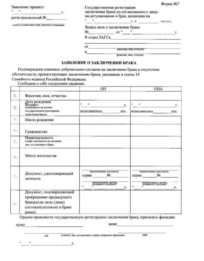 Внизу ставятся подписи и дата подачи заявления. Необходимо обращать внимание на наличие букв «ё» и «й». Их надо прописывать так же, как в документах, иначе свидетельство о браке станет недействительным.
