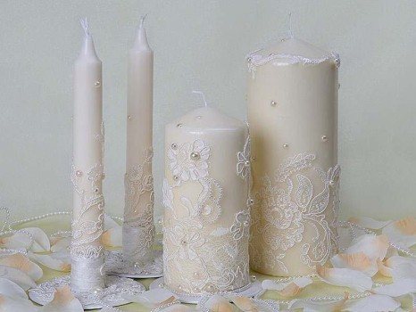Какие материалы нужны, чтобы оформить свадебные свечки? На самом деле, простор для фантазии безграничен: в дело пойдут кусочки кружева, атласные ленты, тесьма, бечевка, стеклярус и бусины, стразы, поделочные камни, декоративная или оберточная бумага, фрагменты из полимерной глины, ракушки, искусственные цветы, цепочки, перья и даже зерна кофе.