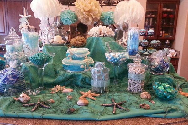 - Морская волна. Украшение на свадебный стол может быть выполнено в морской тематике, которая не теряет своей актуальности уже который год подряд. Используйте модные цвета этого года – тиффани и «ниагара», чтобы сделать декор более модным. В морском декоре используйте полоску, раковины и морские звездочки. На столах можно расставить маленькие миниатюры известных кораблей, а через стол пустить настоящие канаты.