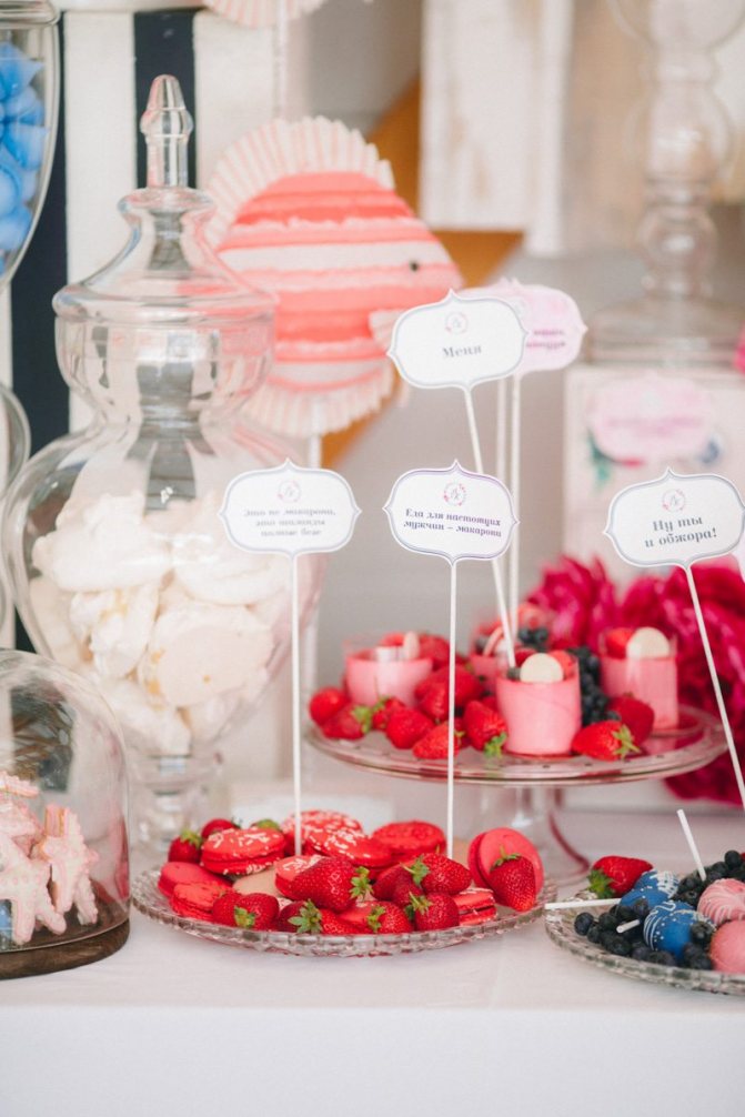 Не стоит забывать и о полиграфии: таблички, указатели и надписи помогут организовать все это сладкое великолепие и избежать вопросов от гостей, что есть что. Кстати, это поможет гостям с аллергией и специальной диетой избежать нежелательных продуктов. Кроме стандартного указателя «Сладкий стол» можно использовать альтернативные и веселые надписи «Сладости для радости», «Рай для сладкоежек», «Love is sweet» и т.д. Не забывай подготовить и ярлычки для десертов: «Съешь меня», «Ням-ням» и «Угощайтесь!».