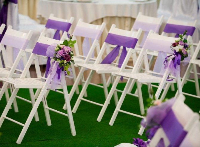 - Стулья. Как правило, на каждый стул надевается специальная нарядная «юбка». Вы можете добавить на спинку каждого стула большой красивый цветок, который будет сочетаться с цветом юбки. Также можно добавить цветку функциональности: на каждом цветке прикрепите бирку с именем гостя. Таким образом, вы получите не только стильное украшение, но и карточки для рассадки.