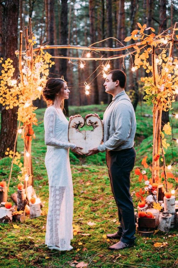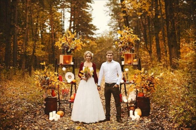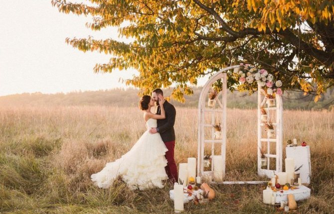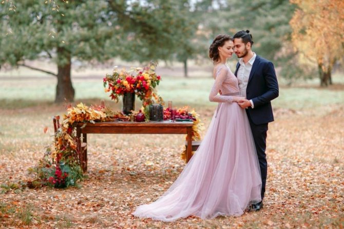 Осенью невеста очаровательна. Платье для нее может быть любым, с рукавом на всю длину или ¾. Капризная осень стимулирует к тому, чтобы запасаться верхней одеждой и аксессуарами: пальто, шуба, шаль, пиджак, рубашки, кардиганы. Обувь может быть любой: ботильоны, закрытые туфли, кеды, сапожки.