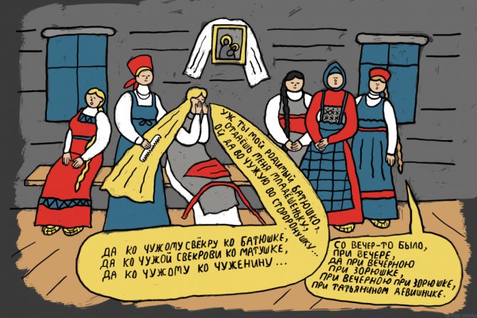 Невеста причитала, прощаясь со своим девичеством и родным домом. Даже если она выходила замуж по любви, то все равно должна была плакать — считалось, что если «не наревешься за столом, наплачешься за углом».