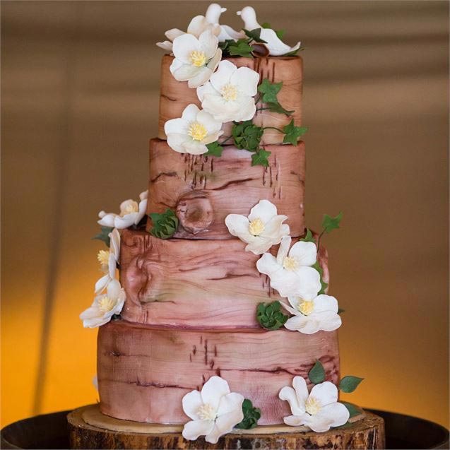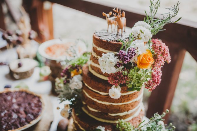 Чудесная и такая сладкая возможность подчеркнуть лесную тематику вашей свадьбы – это сделать необычный тематический торт или украсить традиционный десерт пряниками-фигурками животных, шишками и желудями, съедобными кленовыми листьями и сладкими грибочками.