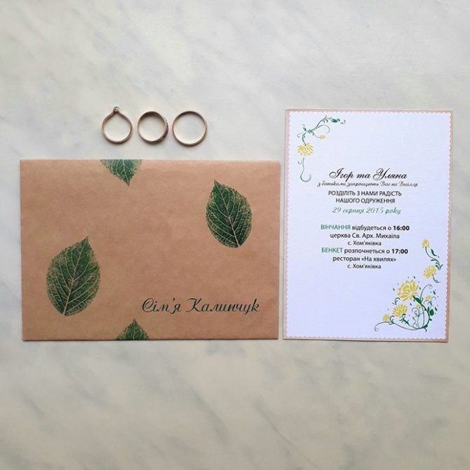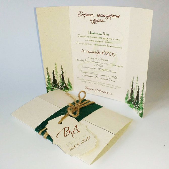 Пригласительные обычно оформляют на крафтовой бумаге. Для декора подойдут веточки, цветы, кусочки дерева, бечевка.