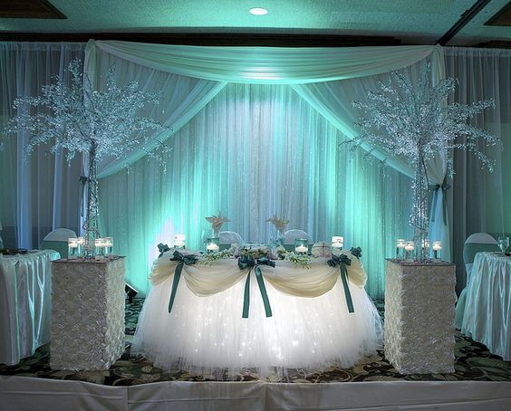 Можно расставить по залу фирменные коробки торгового дома Тиффани, наполнив их искусственными бриллиантами. А классические белые скатерти, прозрачно-звенящий хрусталь и множество белоснежных цветов в изящных вазах только подчеркнут стиль и сделают цвет Тиффани более насыщенным.
