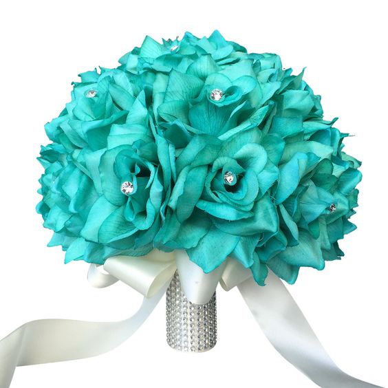 К составлению букета в стиле Тиффани нужно отнестись очень серьёзно и ответственно. В нём должны быть бирюзовые и голубые изысканные цветы. Для этого подходят: гортензия, фиалка и лобелия. Согласись, природа не расщедрилась на изобилие – мало цветов именного данного оттенка. Поэтому можно активно использовать бирюзовые и нежно-голубые ленты и тканевую обвёртку для ножки букета. При этом букет составляешь из белых цветов. Также используй всевозможные аксессуары: бабочки, камешки, бусы, стразы небесно-голубого цвета.