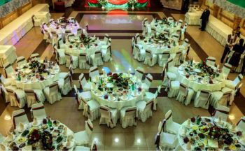 Общая компоновка составляется так, чтобы каждый гость мог видеть молодоженов. Для этого отдельные столы расставляют по залу в шахматном порядке, при этом стол молодых может быть установлен как в центре (расходящаяся лучами планировка), так и перед всеми столами.