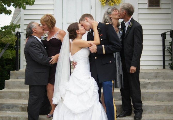 - Хороший кадр получится, если жениха с двух сторон будут целовать в щеку родители невесты, а девушку – родители жениха.