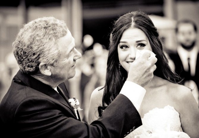 - Не менее трогательно смотрится фотография отца с дочерью-невестой.