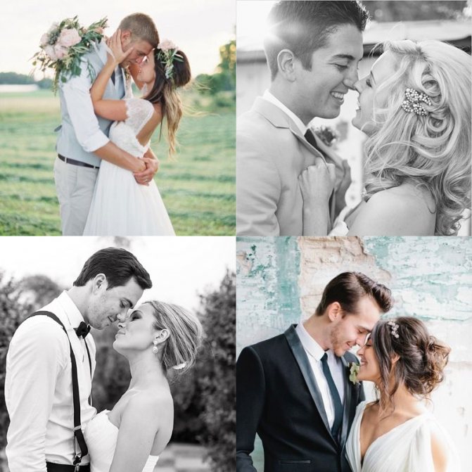 Невероятно нежный поцелуй носиками («эскимосский поцелуй») — красивая поза для свадебной фотосессии.
