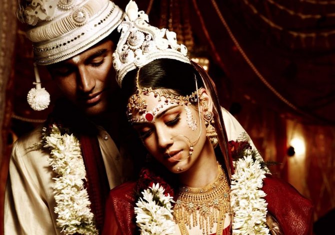 Красный — это традиционный цвет индийских свадеб. Невесты надевают алое сари, вышитое золотом. Оно при этом полностью обволакивает тело девушки. Иногда свадебные сари могут быть сшиты из желтой, золотой или белой ткани. Цвет зависит от региона, в котором проживает невеста. В некоторых штатах Индии сари обязательно украшается позолоченной каймой, которая подчеркивает торжественность праздника. Невесты надевают на свои руки огромное количество браслетов, потому что они приносят удачу. На голову девушки накидывают красную вуаль, а ее шею украшает орнамент из золота. Наряд жениха состоит из шелковой рубашки и ярких праздничных брюк, сшитых из бежевой ткани.