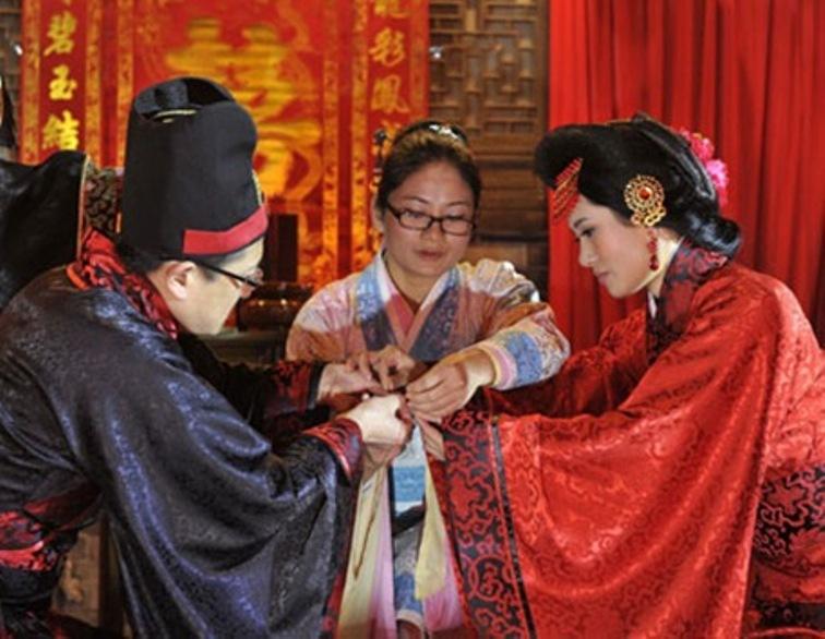 Примечательно, что девушка должна трижды поменять свое платье на протяжении всего празднования. В красном наряде невеста присутствует на свадебной церемонии, а затем переодевается в белый костюм. Классический костюм жениха — это темно-синяя рубашка с красным шелковый поясом и брюки. Поверх мужчины накидывают длинный жакет, пошитый из черного шелка.