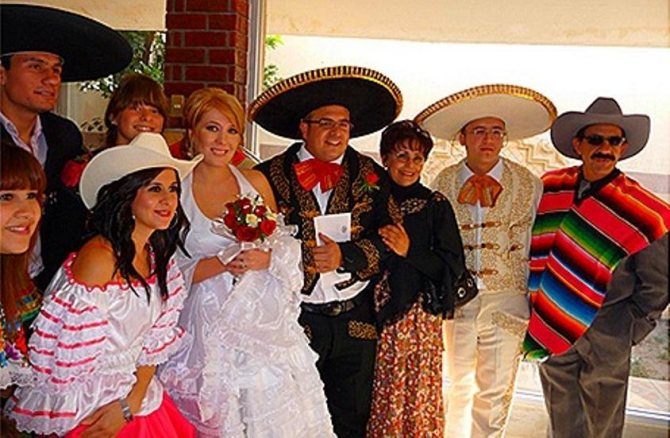 Мексиканская свадьба — это оригинальное сочетание испанских и ацтекских обычаев. Это яркое и красочное торжество. Девушки надевают яркие платья с большим количеством оборок, поверх которого накидывают кружевную мантилью. Костюм жениха состоят из брюк и куртки в стиле матадора. Яркие цвета используются во всем оформлении свадьбы. Это и экзотические цветы, и пиньяты, изготовленные для того, чтобы обсыпать пришедших гостей сладостями и конфетти.