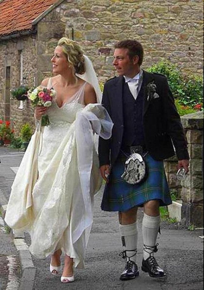 В Шотландии невеста получает в подарок от жениха клетчатый платок и пояс, которым мужчина затягивает талию девушки. Платок он надевает на плечи и закалывает его булавкой из серебра. Эта традиция подчеркивает силу любви молодоженов. Классический костюм жениха на свадьбе в Шотландии — это килт.