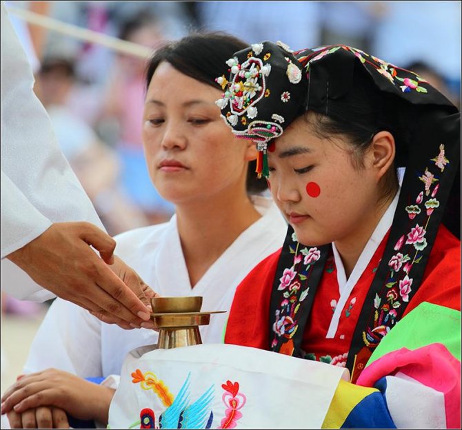 Наряд невесты из Кореи состоит сразу из нескольких платьев, которые последовательно надеваются друг на друга. Считается, что он подчеркивает благородство и аристократизм девушки. В первую очередь надевают платье зеленого цвета, поверх него — цветочный наряд. Оба костюма украшаются вышитыми на ткани цветами и бабочками. Рукава платья должны быть белыми. Этот цвет олицетворяет чистоту и уважение. К ним привязывают разноцветные ленты: красные, синие и желтые.