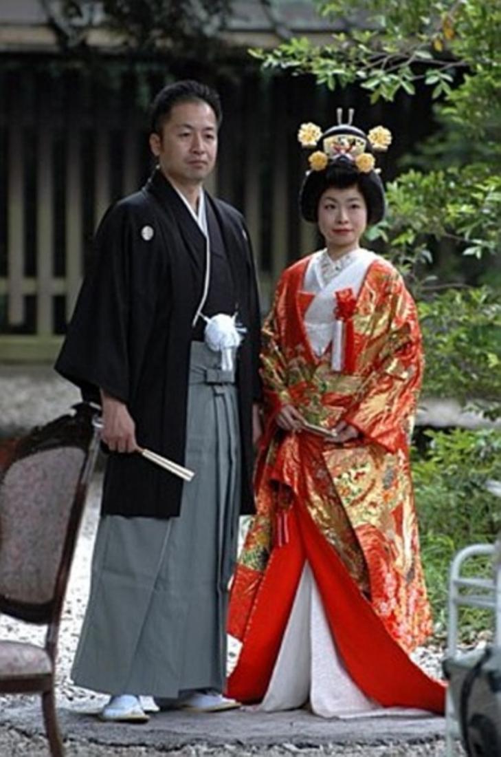 Классический костюм невесты из Японии — это кимоно, сшитое из белого шелка, парчовая накидка, золотые массивные украшения и парик с серебряными шипами и булавками. Иногда его заменяют шарфом или шапкой, которая называется тсуно какуши. Она символизирует уважение к будущему мужу и желание скрыть свои недостатки. В своих руках невеста обычно держит традиционный свадебный веер. После церемонии перед ужином девушка меняет свое кимоно на красно-белое платье, украшенное золотом и серебром. Красный, по мнению японцев, отгоняет злых духов и символизирует семейное счастье.