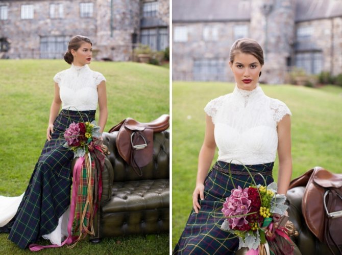В этой стране необычно все, начиная от национального символа (чертополох), заканчивая мужскими нарядами и музыкальными инструментами.Шшотландское национальное свадебное платье также выглядит очень оригинально: это килт (нацилнальная юбка), напоминающая капюшон, привязанный к талии к талии.