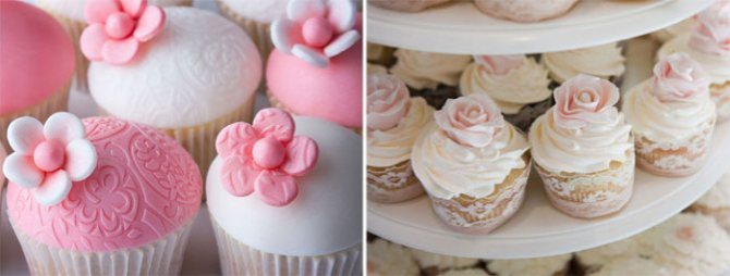 - Мастикой. Из нее можно сделать идеальный по форме десерт, украшенный вылепленными или вырезанными фигурками. Такой свадебный торт из капкейков получается элегантным и изящным.