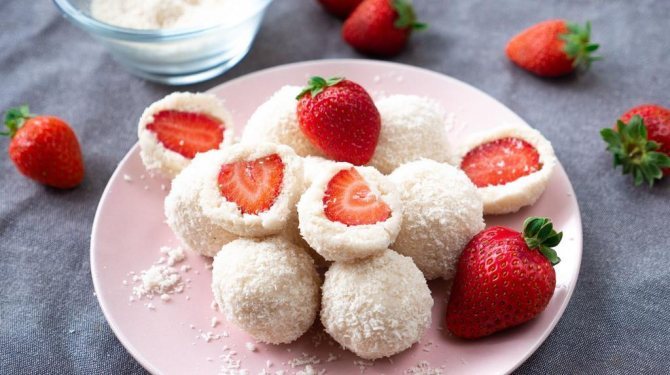 Клубника. В качестве основы — протеиновый порошок в сочетании с йогуртом. Если положить в заправку кокосовую стружку, десерт будет выглядеть еще наряднее.
