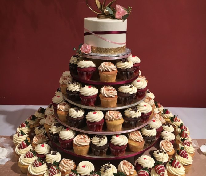 - относительно небольшой торт (иногда двухъярусный, но чаще в один ярус), дополненный некоторым количеством капкейков (красиво украшенных порционных кексов). В этом случае угощение подают на специальной подставке с несколькими ярусами, причем торт располагают наверху, капкейки – ниже;