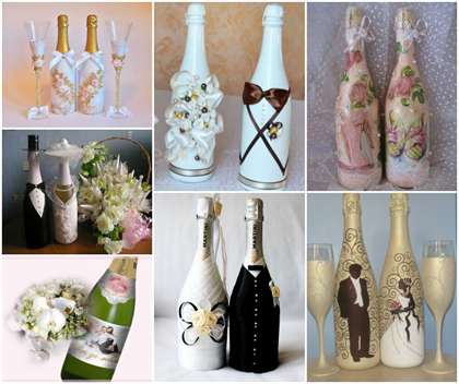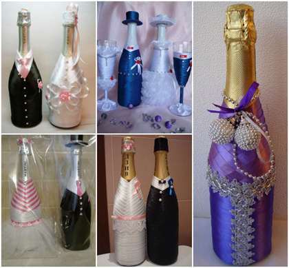 Декорировать бутылки с шампанским, можно в одном стиле с фужерами. Или использовать другие техники, материалы, разнообразные элементы.