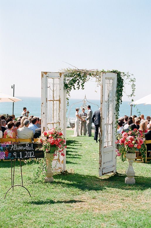 Дверь можно использовать как условную зону входа на церемонию или даже вместо арки. Кстати, это может быть не только дверь, но и стена, сколоченная из досок с обоями в романтичный рисунок. А если дополнить композицию уютными креслами, цветами и подсвечниками – получится не хуже, чем в портфолио у лучших декораторов.