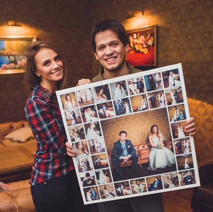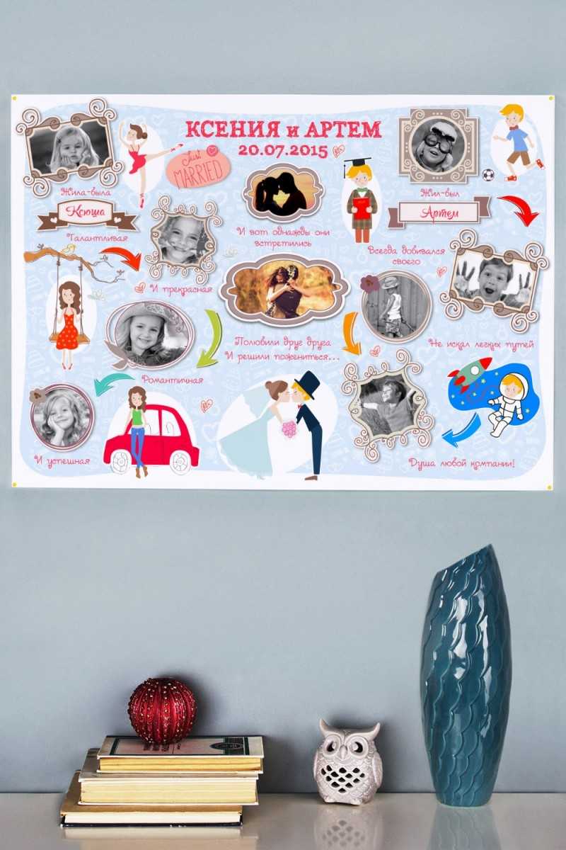 Хорошим презентом на долгую память может послужить стен газета с использованием фотографий виновников торжества. Можно использовать как новые, так и старые, к примеру, кадры со дня росписи. Вам пригодится: