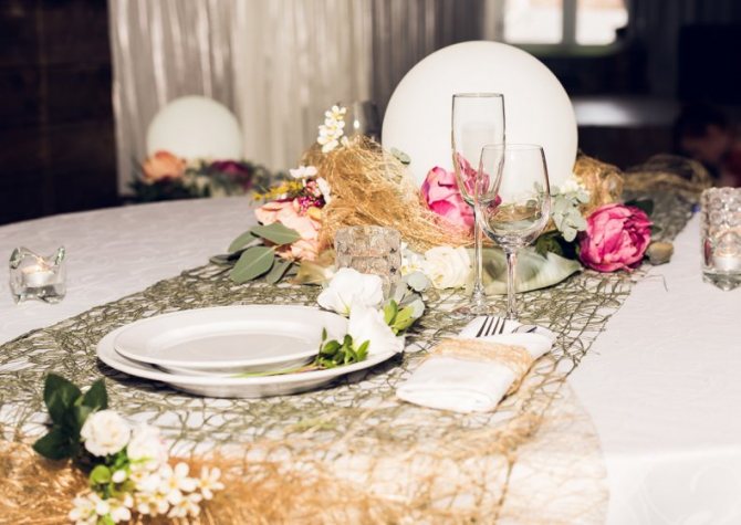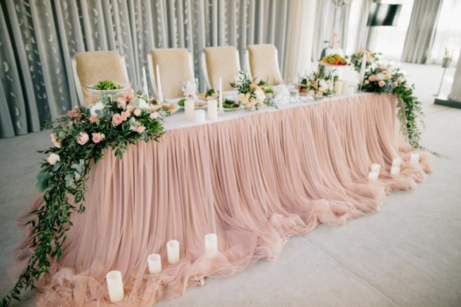 - Драпировка стола молодоженов. Таким образом украшение в сочетании с миниатюрными композициями из цветов смотрится легко и непринуждённо. Благодаря такому декорированию удаётся выделить главных инициаторов торжества.