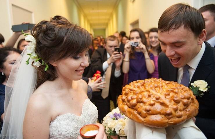 Встречая молодых с караваем, родители просят молодоженов оторвать без рук по куску каравая. Кто отломит большой кусок, тот и будет хозяином в доме. Ранее по традиции жены старались оторвать меньший кусок. Связано это с тем, что муж приводил в родительский дом жену, там же он был и добытчиком. Поэтому жене было негоже откусывать большой кусок.