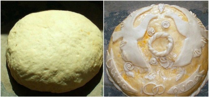 Подготовьте противень, смажьте его маслом. На нем сформируйте форму каравая, форма должна быть круглой не высокой и не низкой, как в фольклорной песне. Смочите будущий каравай водой, чтобы он не подсыхал, а этим временем займитесь украшением. Сделайте тесто для украшений более упругим, добавьте в него муки. Сформируйте украшения: лепестки цветов, ветки калины, колосья пшеницы, птицы соколы, голуби. Можно добавить имена молодоженов.