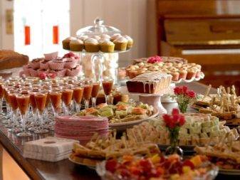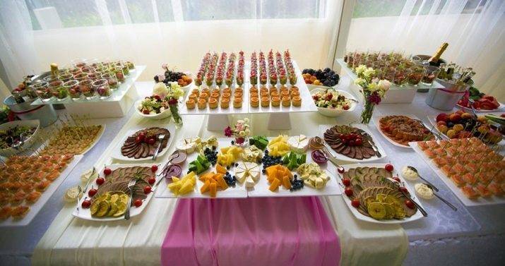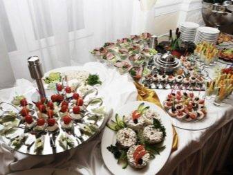 На каждого человека должно быть рассчитано одно горячие блюдо с содержимым примерно в триста грамм. Обязательно должен быть гарнир и какое-либо запеченное мясо. К холодным закускам относятся разного рода салаты, рулеты из лаваша и канапе. Также должна присутствовать сырная, рыбная, овощная и мясная тарелки. Они ставятся общими блюдами для удобства гостям брать то, что захочется.
