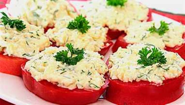- Начинка выкладывается равномерно на ломтики помидоров.