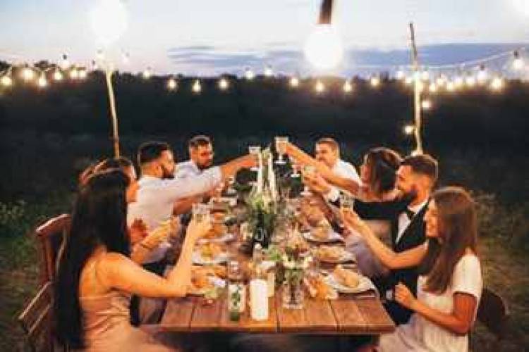 Застолье на даче отличается тем, что при составлении блюд, молодожёны не могут ориентироваться с подачей холодных и горячих закусок. Главное отличие свадьбы – это её неограниченное время. В среднем на каждого человека приходится 1,5 килограмма блюд.