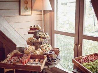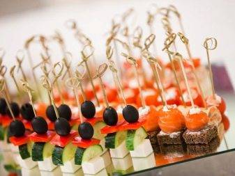 В тон столу можно подобрать и закуски. Каждая порция должна быть рассчитана на то, чтобы ее можно было съесть за пару укусов. В идеале при таком варианте сервировки стоит разделить столы, выставив на одном горячие закуски, на другом сладости, на третьем – алкогольные и безалкогольные напитки. Такой вариант подойдет даже для большого мероприятия.